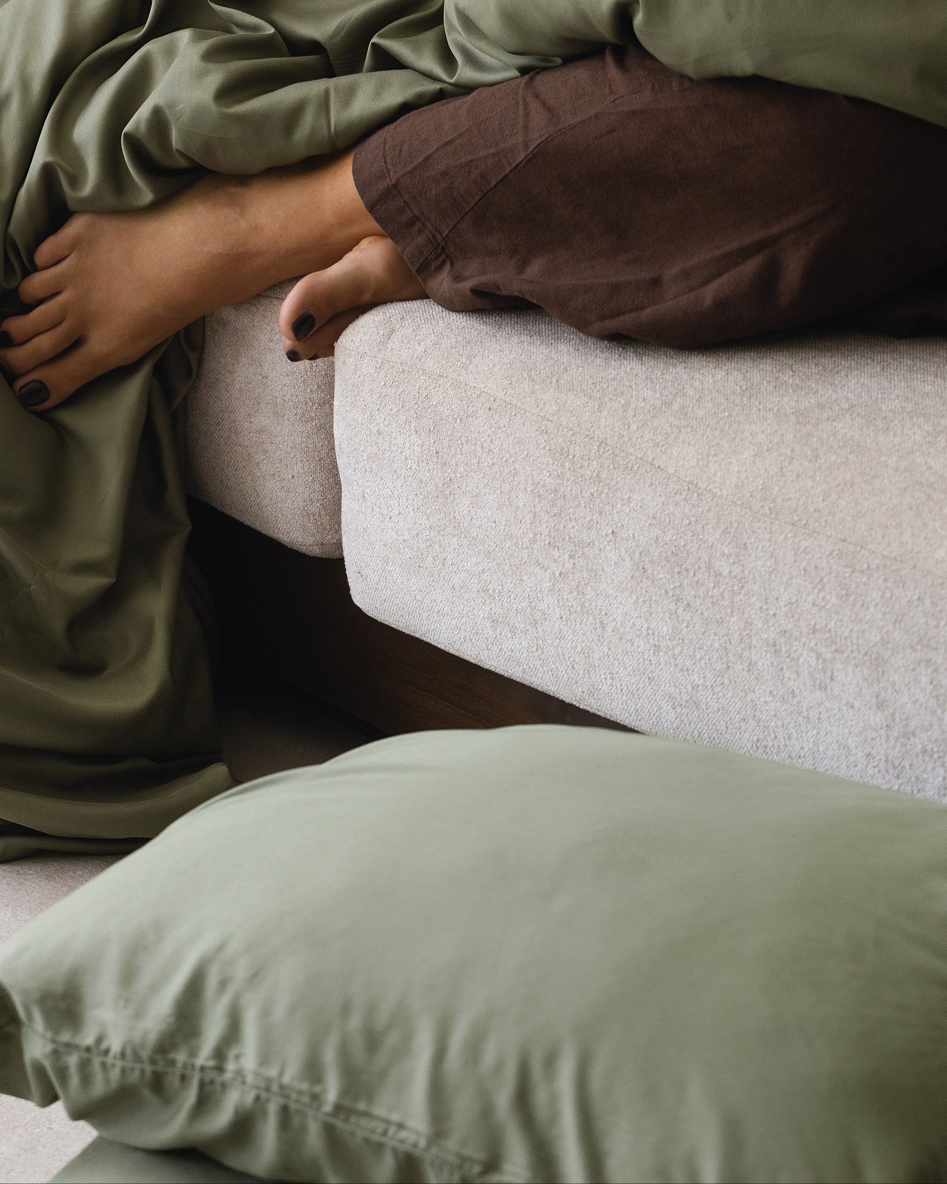 Person sitting on a bed with Hampton Rosé pillows and a wooden headboard