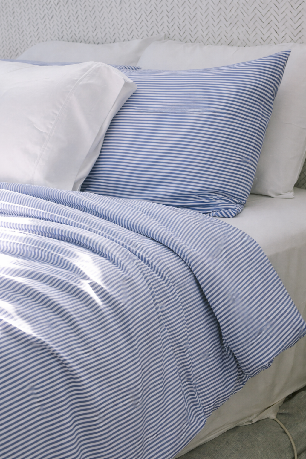 Ibiza Stripe pillowcase and bedding in a dim, softly lit room