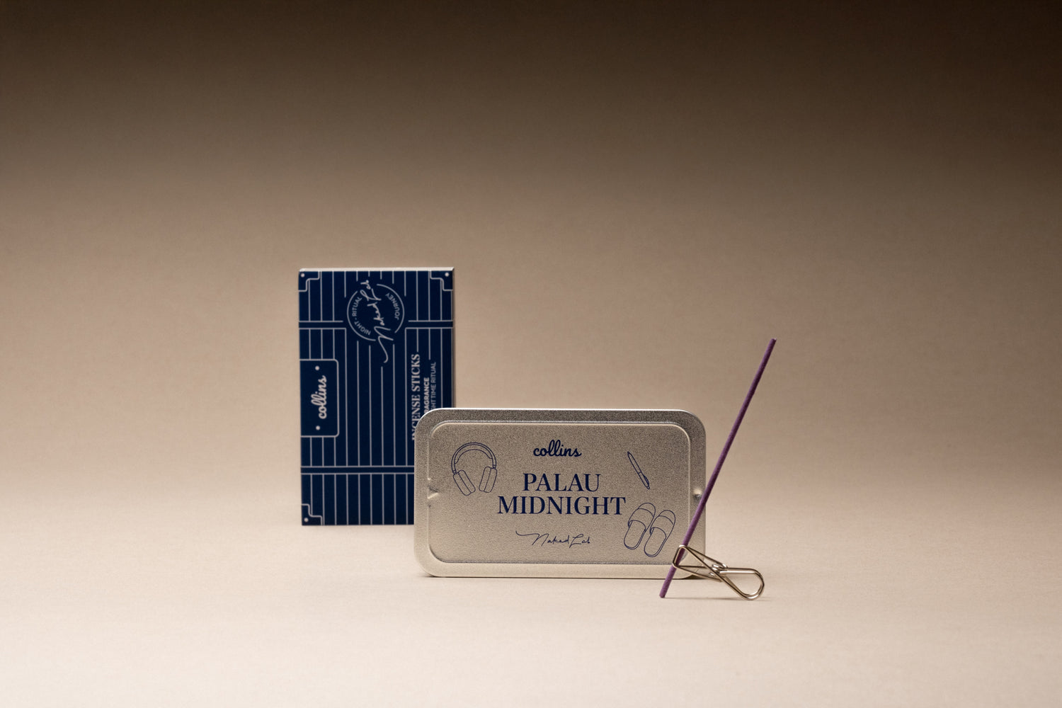 A beautifully designed NakedLab x Collins Incense Metal Tin Case (which doubles as a tray), two Incense Holder Clips, and 70 Palau Midnight inspired Incense Sticks.